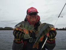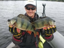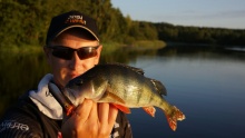 Первый тур. С самого старта летим в самый дальний конец озера, где впадает речушка. На треньках там худо бедно поклевывала щучка, и были надежды на её утренний клев. Но сменив с десяток якорей, и потратив минут 40 времени, словили только одну незачетную зубастую и поимели по паре поклевок. Летим дальше по точкарям. Напротив мыса тормознули на щучьем рдесте, но не успели сделать по забросу, как увидели, как окунь гонит малька и чавкает. И это несмотря на нехилый ветер и волну. Хватаем палки с попперами и закрываемся двумя заветными окунями, один из которых за 30-ку.