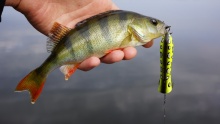Начало положено. Затем ещё минут сорок провала, точки на большом зеркале молчат. Решаем рвать когти на окуневые площадки и попперить. Сказано - сделано. И понемногу жизнь начала налаживаться. Планомерно чешем берега, то там, то тут ловя неплохих окуней. В одном из мест, чисто интуитивно решаю сделать пару забросов джигом, и ловлю прямо из-под лодки зачётную щучку. Тем временем, попперно-окуневые места заканчиваются. Вместе с тем, небо застилает тучами, раздувает ещё сильнее, решаем пробежаться по щучьих местам. Щука, сволочь, только издевалась над нами то холостыми поклевками, то откушенными хвостами, то сходами.