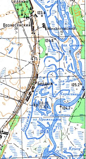 В районе д. Бердыж, расположенной примерно в 7 км на юг от г. Чечерск, в пойменной и припойменной зонах р. Сож находятся 36 безымянных пойменных и старичных озер. Данные озера относятся к территории Чечерского района Гомельской обл. Сведений об их параметрах и окружающей их местности не найдено.
