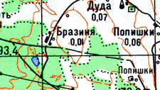 Озеро Бразиня (безымянное) находится в Островецком районе Гродненской обл., примерно в 28 км на север от г.п. Островец, примерно в 0,3 км на юго-запад от д. Бразиня и относится к бассейну р. Вилия. Местность грядистая, местами поросшая лесом и кустарником.