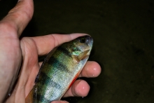 Вчера после работы, с восьми часов выбрался на речку. Думал зацепить зорьку и немного половить ночью. Пришел на первую точку, сделал пару забросов, сменил место, еще покидал и увидел первую поклевку. Достаточно увесистый окунек повис на шадике. Первая голова есть, решил изучить рельеф. Через минут пять в сопровождении фрикциона ощутил дикий удар и злость гоблина полосатого, который рисовал не плохую перспективу на вечер. Вот только во время фотосета прибежал балдуин с энннным количеством ломак и супер меткими забросами стандартной 0,4 леской наложил кормушек где попало и куда попало. Везде дуги лески, и быстро растущее желание набить морду – вечерний клев удался короче (и не нужно мне рассказывать, что доночники тоже люди, люди это когда пришел на свободное место и ловит тихонько, а особи лезущие через голову и в наглую свои говноснасти пучком кидающие – это рыболовные дебилы, об этом говорит и умно собранная снасть и подход к процессу ужения рыбы). Пока не надоело ловить из под чужой лески, успел страшно удивиться, как оказалось сомнения мои по поводу неординарных мертвых зацепов были очень даже кстати. Тягая приманку по каменистому перекату, часто было слышно тычок, после которого следовал мертвый зацеп, и что самое интересное иногда под натяжением шнура было слышно биение рыбы. В этот раз было так же. Первый такой случай закончился срезом приманки о камни. После чего я поставил флюр потолще и при такой же ситуации, которая не заставила себя ждать, зашел в воду, чтобы проверить все же что это такое. К своему удивлению на крюке с приманкой Keitech shad impact висел налимчик, который при натяжении лески из под камня выплыл сам. Именно он и стал звездой вчерашнего вечера. И перед камерой покрасовался и офигевшие болдуины бегали оравши – нихрена себе налима на твистер поймал))) Помучал, в общем, этого червяка бородатого, утопил и решил перейти на ночное место, а идти на него не мало. Оббрасывая точку убедился, что пора менять приманку и сходу начали просыпаться окуня. Опять fat g-tail grub от reins, в пинк лохе творил чудеса, единственное размер основного улова как то не особо радовал, но поклевки были достаточно жадные, что приносило море удовольствия.