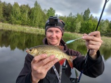 отправились на поиски более крупной краснопёрки на сбирулино. Но задача усложнялась двумя факторами: во-первых, это постоянно меняющаяся погода, а во-вторых, это огромная акватория, и найти краснопёрку среди этого "моря" стариков и затонов было задачей не из лёгких. День поиска и нам всё таки удалось найти концентрацию этих красавиц. В одном из глухих стариков в мелководном заливчике, где глубина была максимум полметра, а дно было полностью заросшее травой. Ловили сбирулинами 5 и 8 грамм, метровый поводок из флюра диаметром 0.17-0.2 и крючок №12-14. В качестве наживки бутерброд из опарышей и кастеров.
